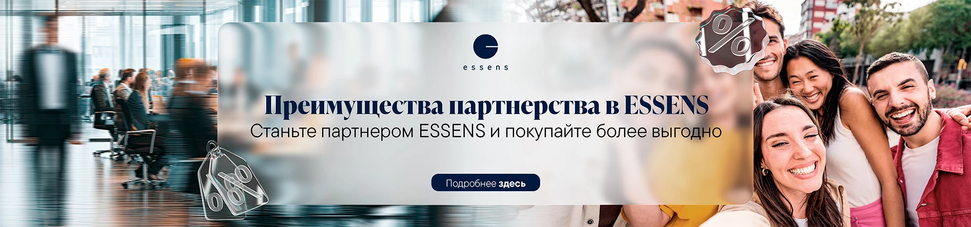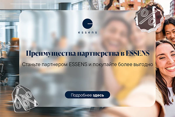ESSENS — это синоним качества и инноваций. Откройте для себя роскошные парфюмы с высокой концентрацией ароматических эссенций, натуральную косметику, которая заботится о вашей коже, биологически активные добавки для здоровья и энергии, а также товары для дома, которые делают повседневную жизнь проще. Присоединяйтесь к нам и предлагайте своим клиентам только лучшее!